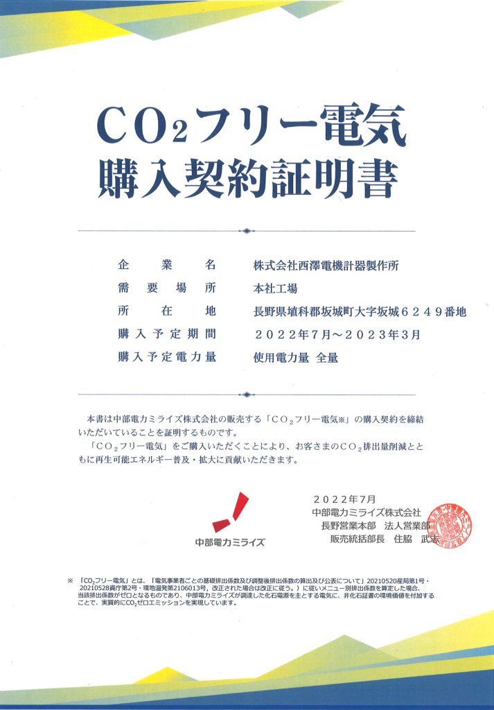 株式会社西澤電機計器製作所は、2022年7月1日より中部電力ミライズ株式会社が提供するCO2フリーメニュー※(ミライズGreenでんき)を坂城本社(長野県坂城町生産工場)の電力に導入致しました。
