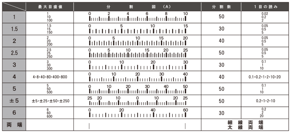 ■読みやすい目盛ということを考慮して、スケール板の大きさ(型名)や指針形状、最大目盛値により、標準目盛分割を決めてあります。